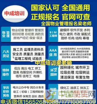 物业经理报名电话微信18800162207,18311352343,QQ1277366319联系人找中成培训郭老师建筑企业,物业公司等企业3A信用认证费用8500一套(一牌七证)物业经理证书是指建设部